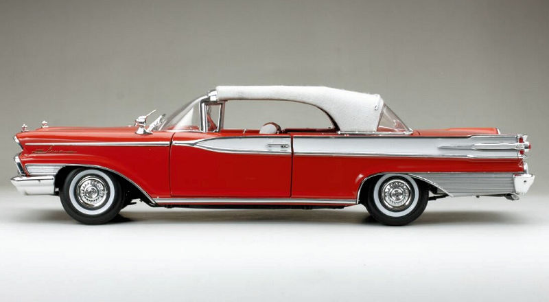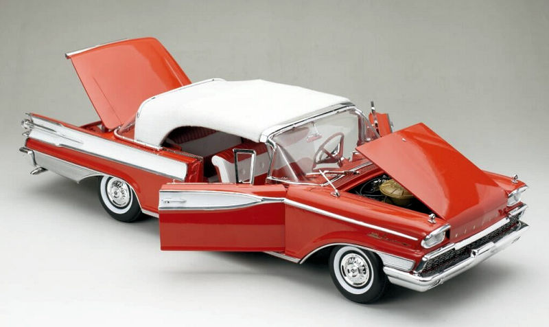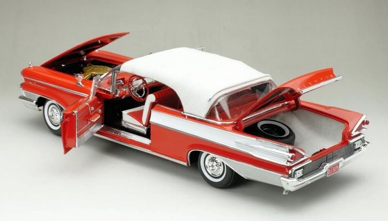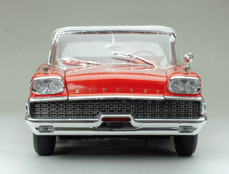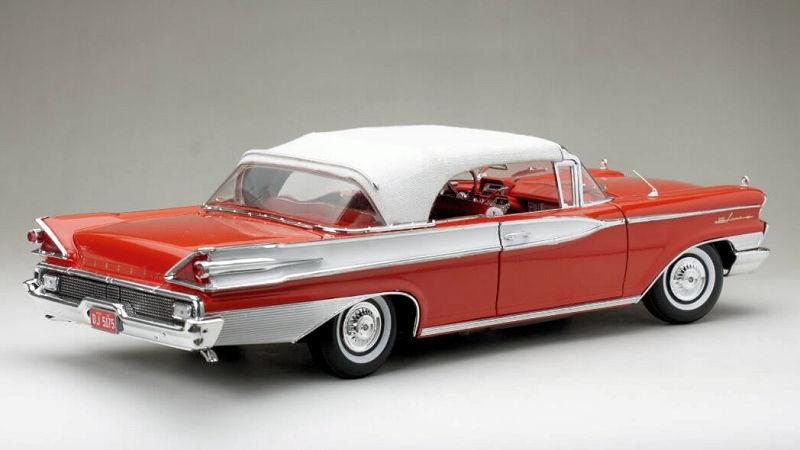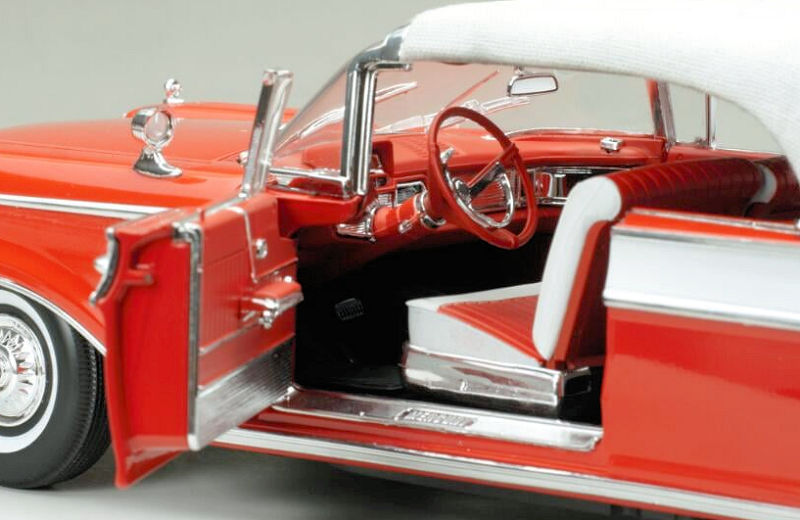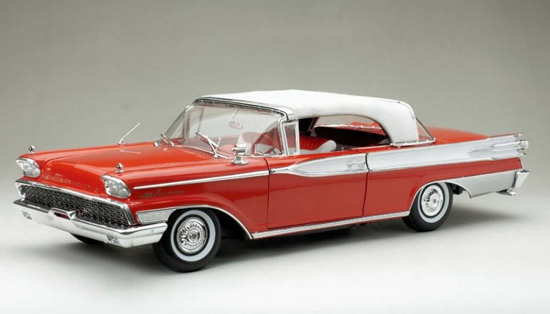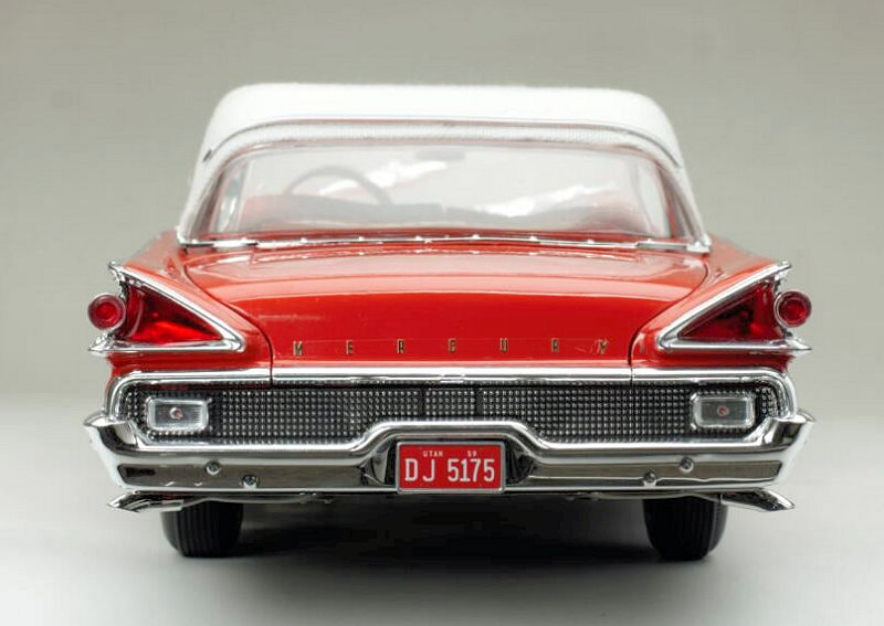 De su serie Platinum viene el Mercury Park Lane Closed Convertible de 1959 en escala 1:18, de metal, con acceso total, en blanco/rojo Canton. La serie Platinum es la de mas alta gama de esta tradicional marca de autos a escala
